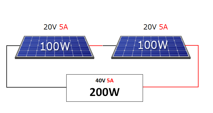 20Vで5Aの100Wソーラーパネルを2枚直列に接続しています。