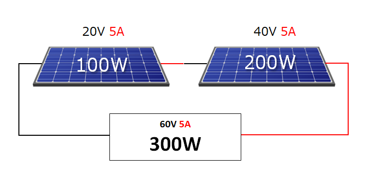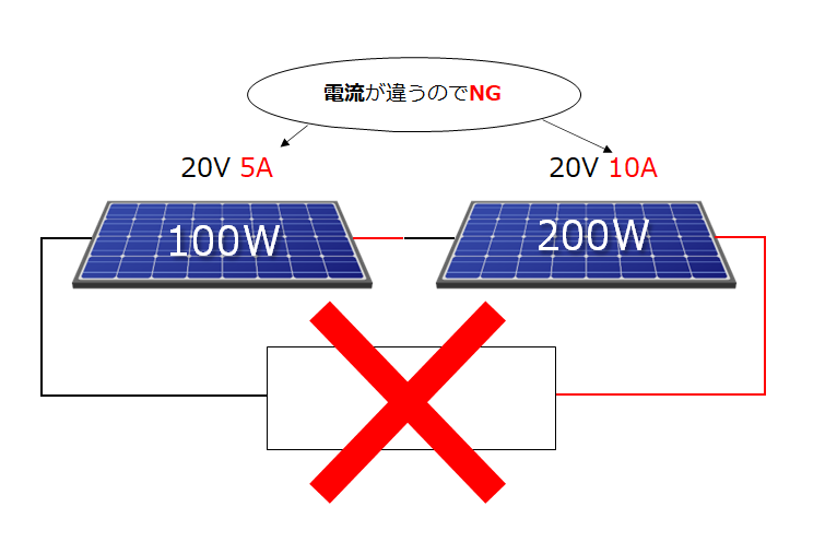 ソーラーパネルの電流が違う値なので電圧が同じでも接続することはできません。