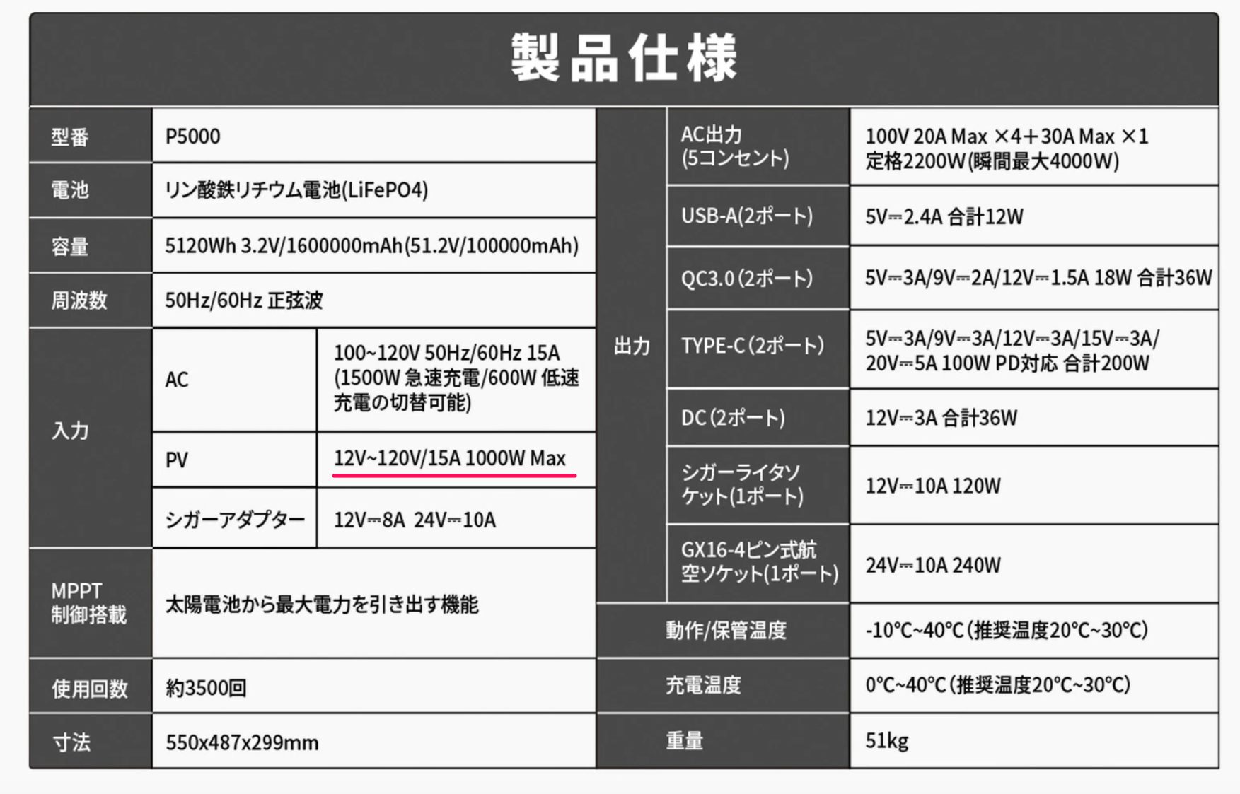 EENOUR P5000(5.12kWh)は、PV入力が12−120Vで1000Wまでの入力が可能。